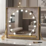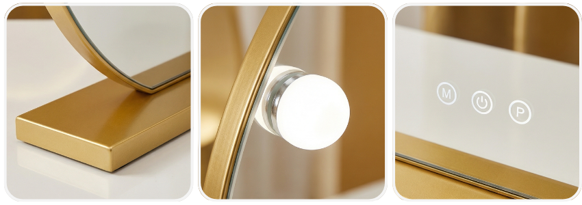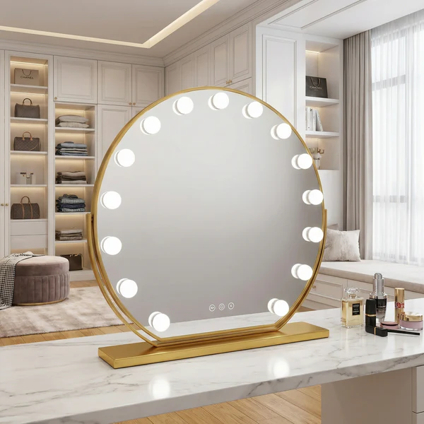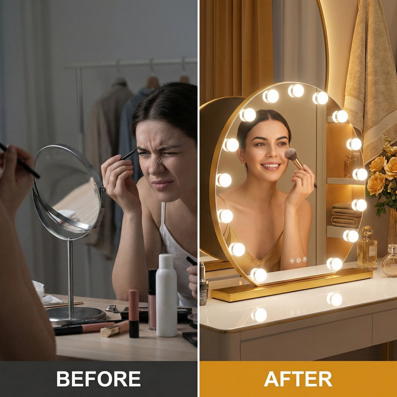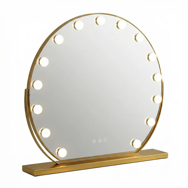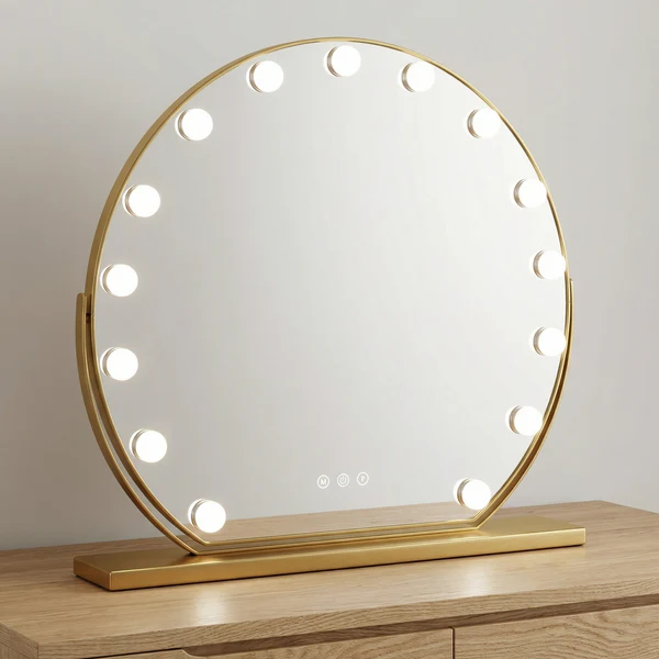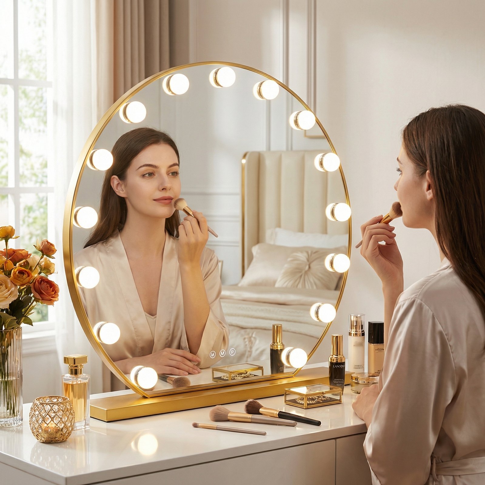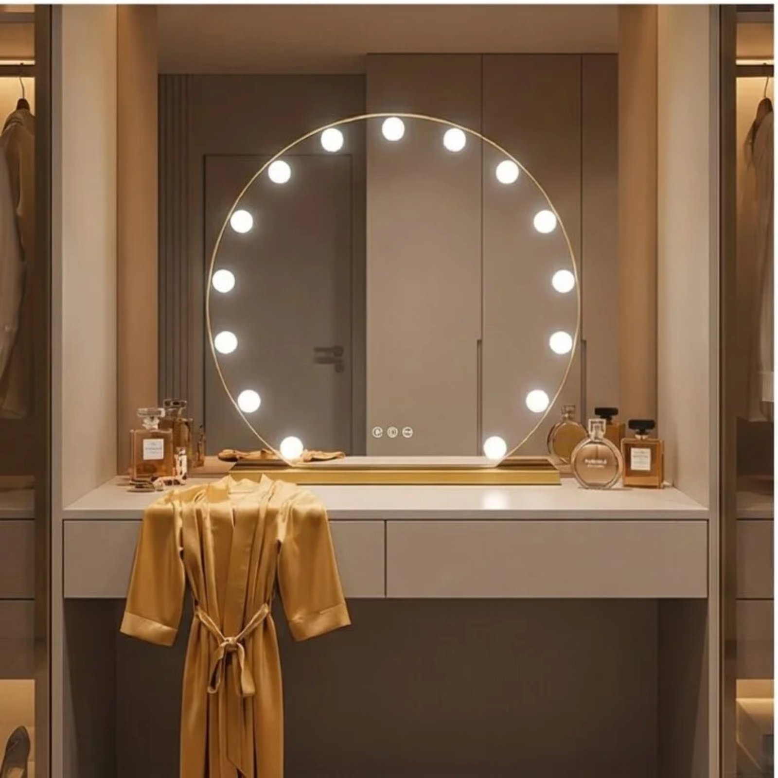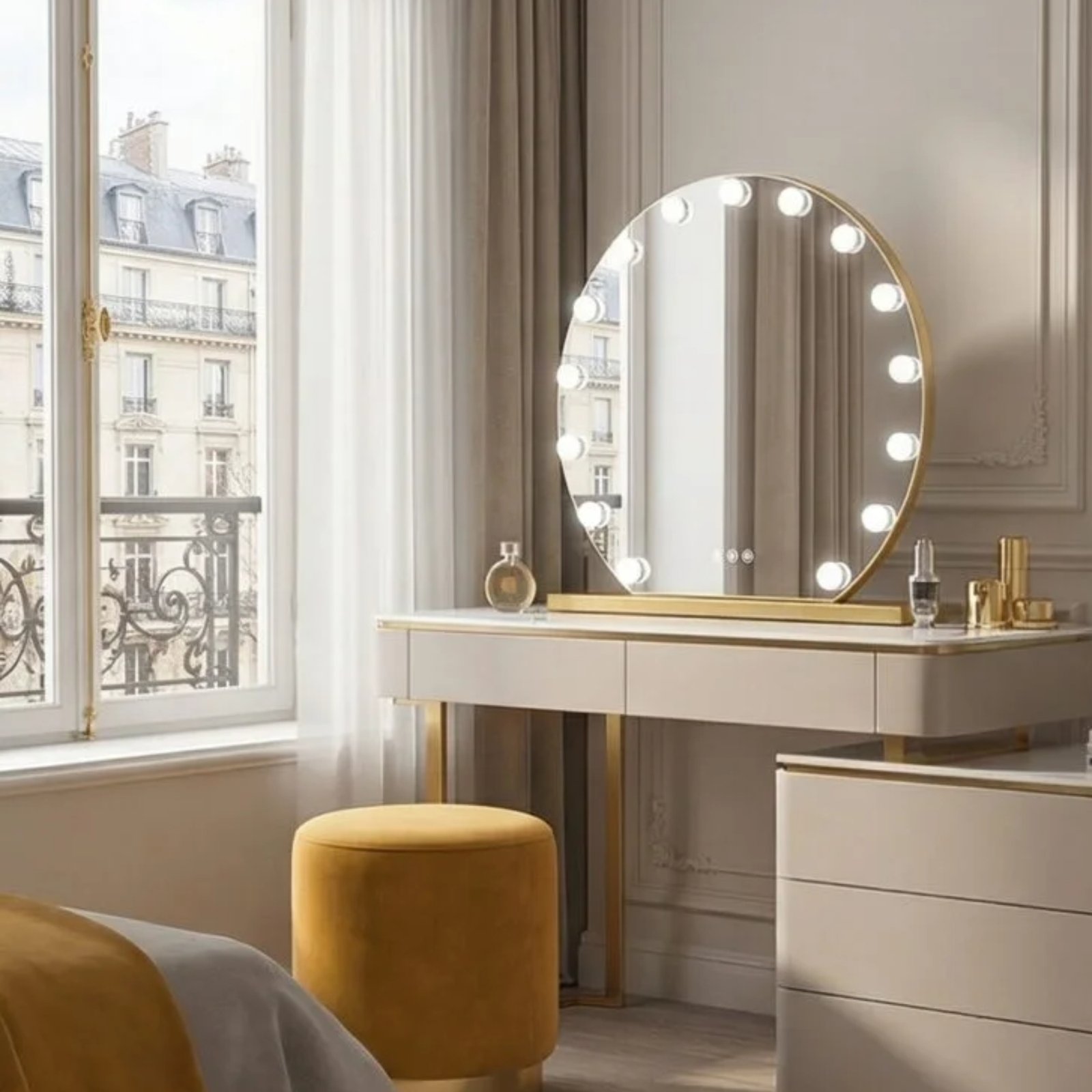 Transform your morning routine with the AuraGlow Gold Dressing Table Mirror. Featuring 11 professional LED bulbs, this mirror eliminates shadows for flawless makeup application. The sleek gold metal frame adds a touch of luxury to any bedroom, while the smart touch controls allow you to adjust brightness effortlessly for perfect studio-quality results.
