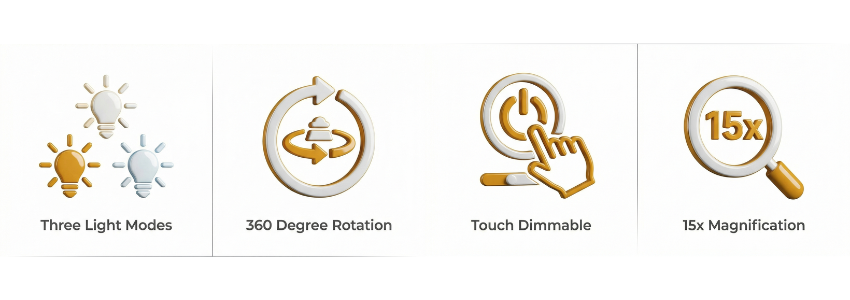 • 15x Magnifying Tool: Includes a suction-base spot mirror for detailed eye work.