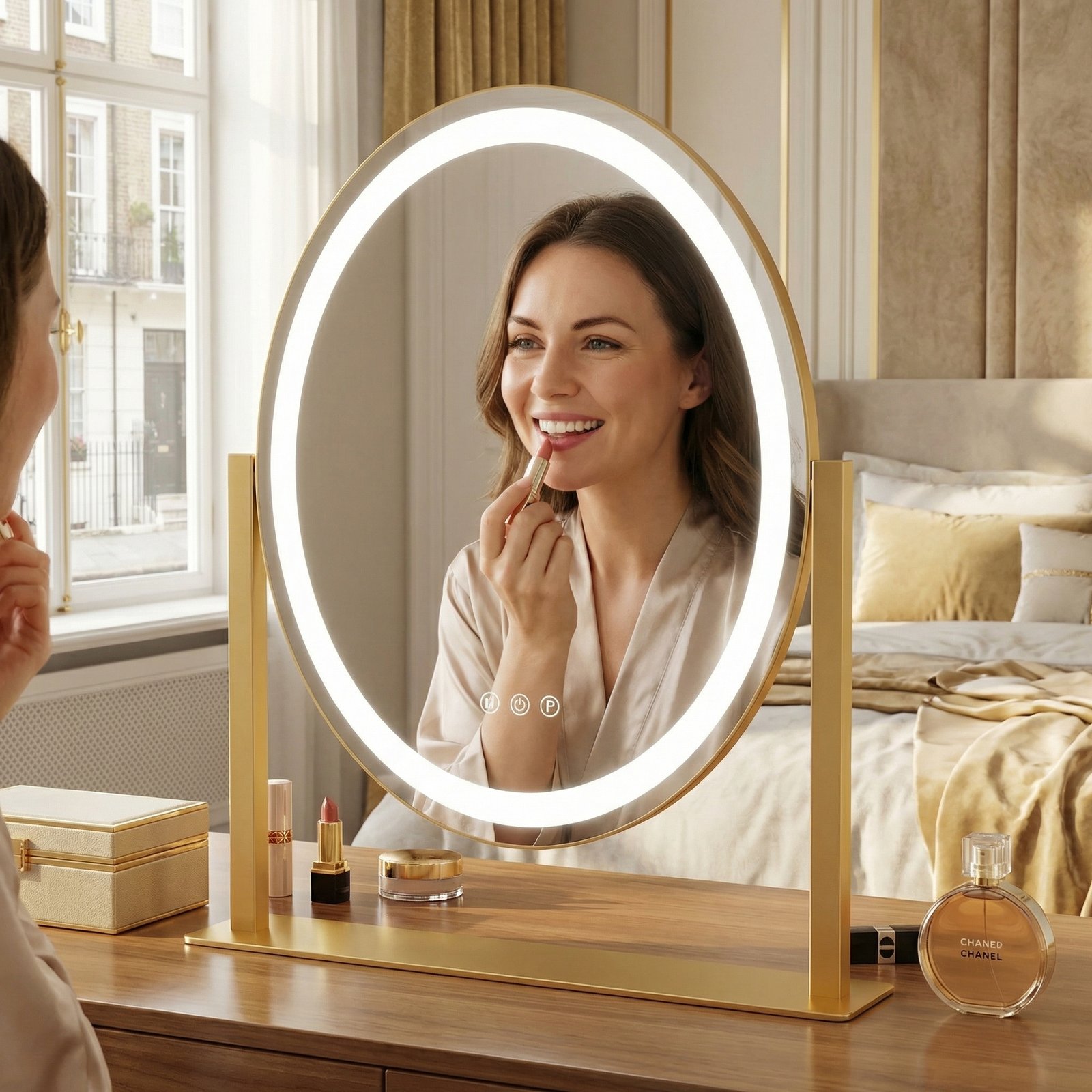 The Lumina Luxe LED Vanity Mirror transforms your daily beauty ritual into a professional experience. Featuring high-definition clarity and integrated LED lighting, this gold-finished metal mirror provides the perfect illumination for flawless makeup. Its sleek art-deco design fits perfectly on any dressing table, offering both functionality and a touch of modern luxury to your bedroom.