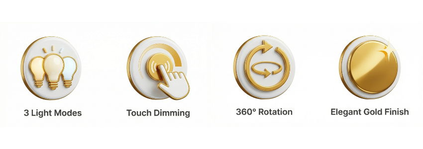 - Features: 3 Adjustable Light Modes, Smart Touch Dimming, Full 360-Degree Rotation.