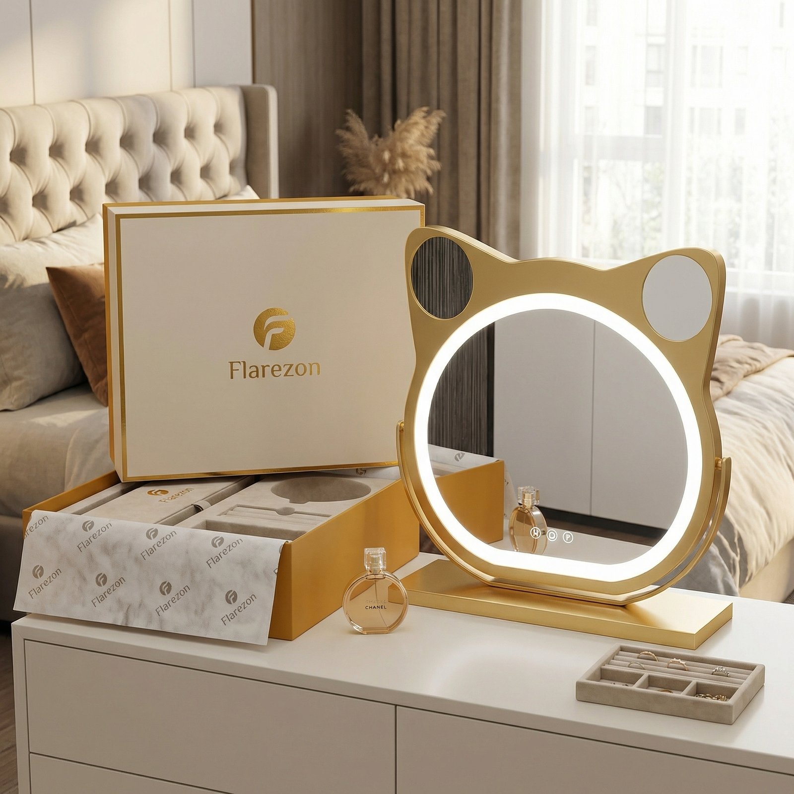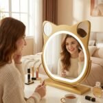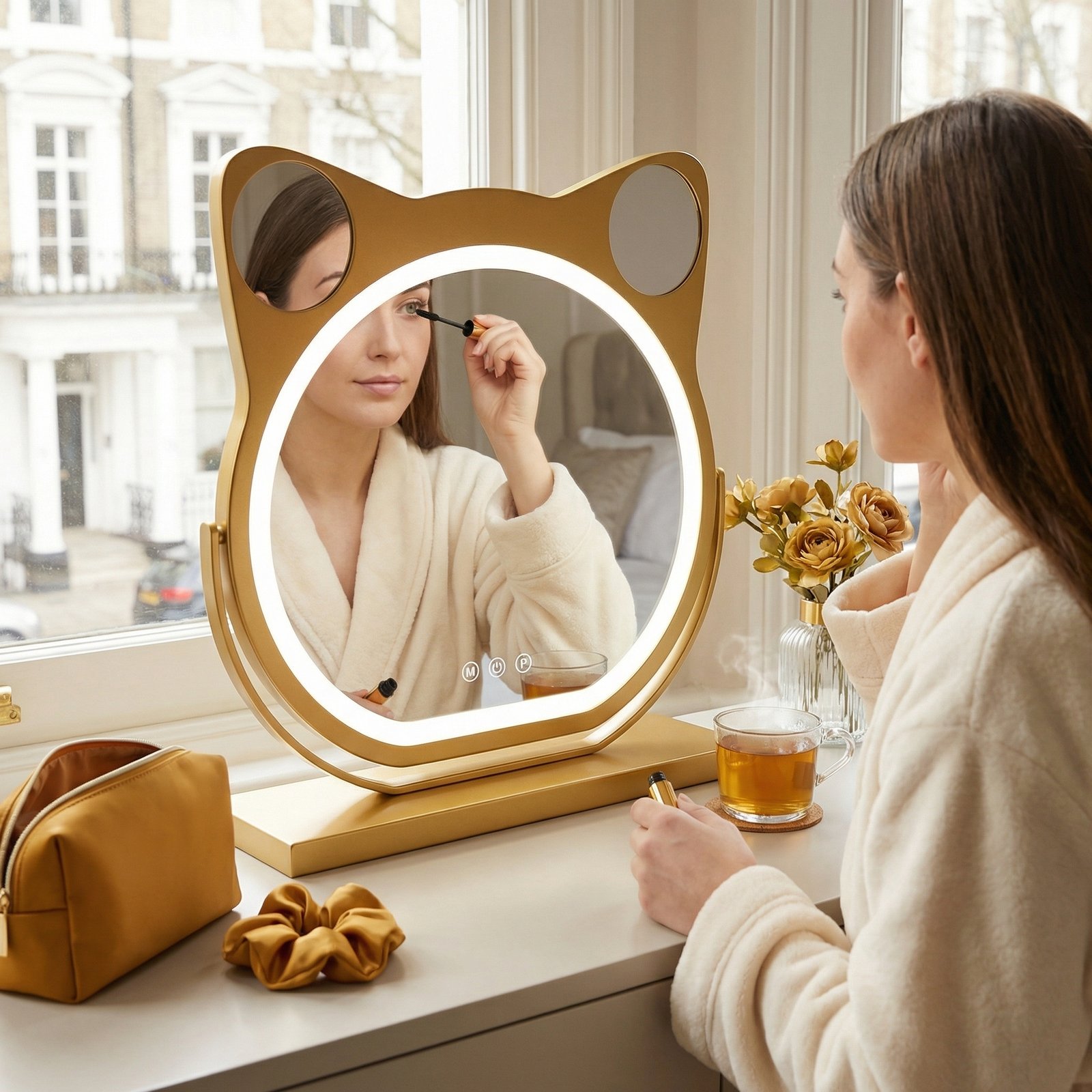 Built for durability and style, the sturdy metal construction ensures long-lasting stability. The smart touch control allows for seamless dimming, while the 360-degree rotation offers the ultimate viewing angle for intricate detail work. Upgrade your routine with a professional-grade illuminated mirror that combines whimsical cat-ear aesthetics with sophisticated, high-performance lighting technology.