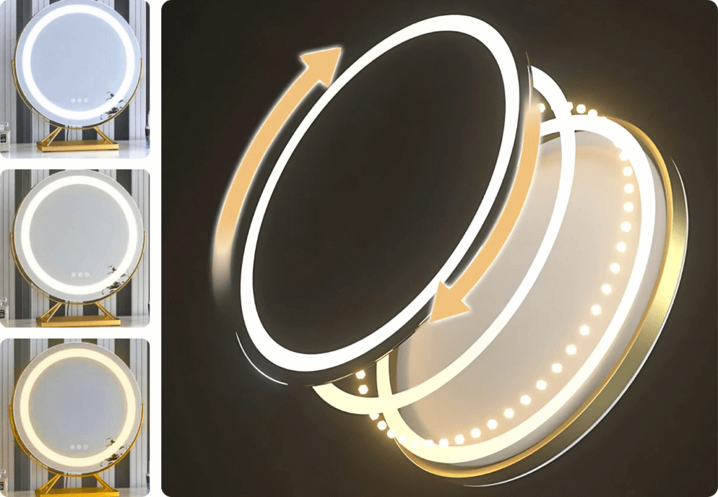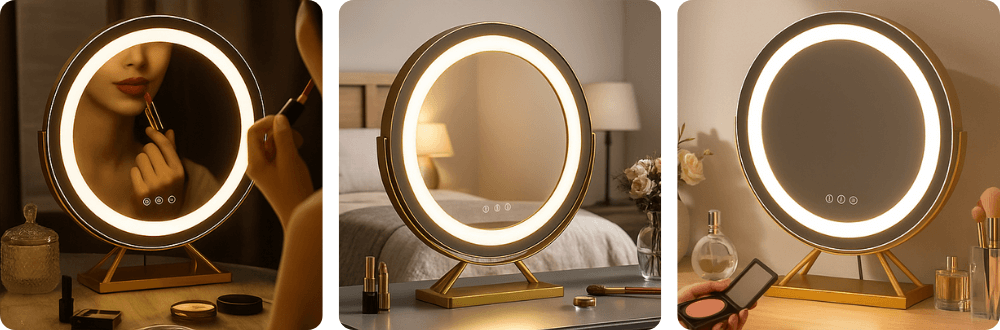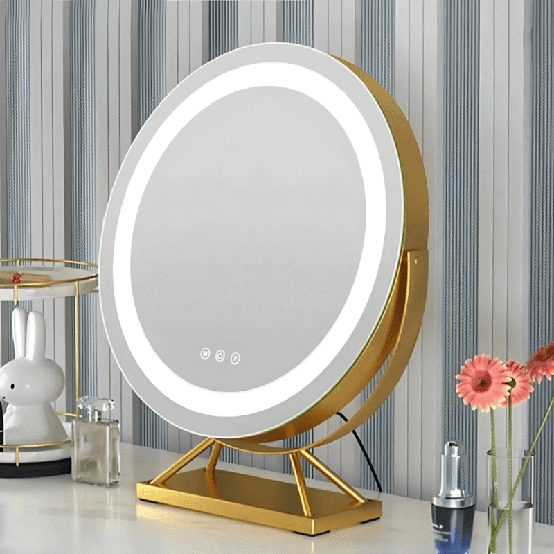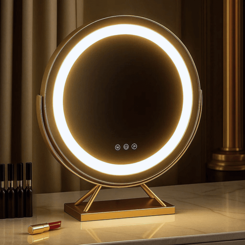Honestly wasn’t sure at first but I’m glad I went for it. The lights are brill – I mostly use the daylight one and it makes such a difference when I’m putting makeup on before work. The gold colour looks really posh on my dresser too. Only thing is the plug wire feels a tad short if your socket isn’t right there, but that’s not a deal breaker. Been using it for about 3 weeks now and it’s solid, no wobbles, and the little magnify bit is handy (tho I don’t use it every day). Def recommend, feels like the mirrors you get in proper makeup studios.